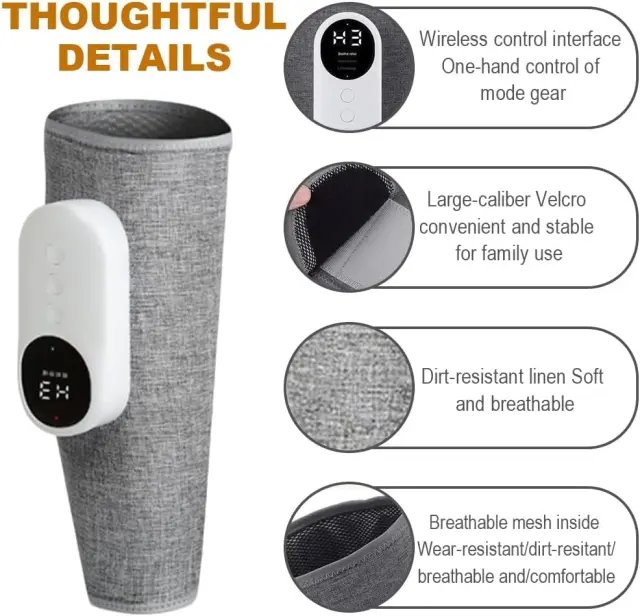 Relaxing Air Compression: Prosimo, upoštevajte: to niso originalni deli. Doživite vrhunsko sprostitev z našim brezžičnim masažnim aparatom za noge s progresivno masažo z zračnim tlakom. Ta inovativna tehnologija nežno stisne in sprosti, spodbuja cirkulacijo in lajša utrujenost mišic. Zasnova z zračnimi blazinami zagotavlja udobno in učinkovito masažo, ki cilja na ključne točke pritiska v vaših mečih in stopalih. Uživajte v pomirjujoči masaži v udobju svojega doma, kadar koli jo potrebujete. Ta masažni aparat za noge je kot nalašč za tiste, ki dolgo stojijo ali sedijo, športnike, ki okrevajo po vadbi, ali vse, ki iščejo olajšanje nelagodja v nogah. Nastavljive stopnje intenzivnosti vam omogočajo, da prilagodite masažo svojim željam, kar zagotavlja prilagojeno in učinkovito zdravljenje. Brezžična zasnova ponuja svobodo gibanja, tako da se lahko sprostite in sprostite, ne da bi bili privezani na električno vtičnico. Kombinacija zračne kompresije in toplotne terapije naredi ta masažni aparat za noge idealno rešitev za lajšanje napetosti in spodbujanje splošnega dobrega počutja.