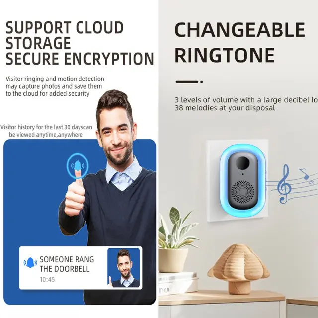 Izboljšana varnost doma: Izboljšajte varnost svojega doma s tem brezžičnim pametnim video zvoncem. Z visoko ločljivostjo kamere 1280x720 ta zvonec zagotavlja kristalno čiste slike, ki vam omogočajo natančno spremljanje vašega praga. Širokokotni objektiv zajame širok pogled, kar zagotavlja celovito pokritost vašega vhoda. Z zmožnostmi nočnega vida in kompenzacijo bele svetlobe lahko ohranite jasno vidljivost tudi v slabih svetlobnih pogojih. Funkcija zaznavanja gibanja PIR vas opozori na vsako dejavnost, kar zagotavlja dodatno raven varnosti in miru. Ta pametni video zvonec je bistven dodatek vsakemu sodobnemu sistemu za varnost doma, ki ponuja zanesljivo in priročno spremljanje.