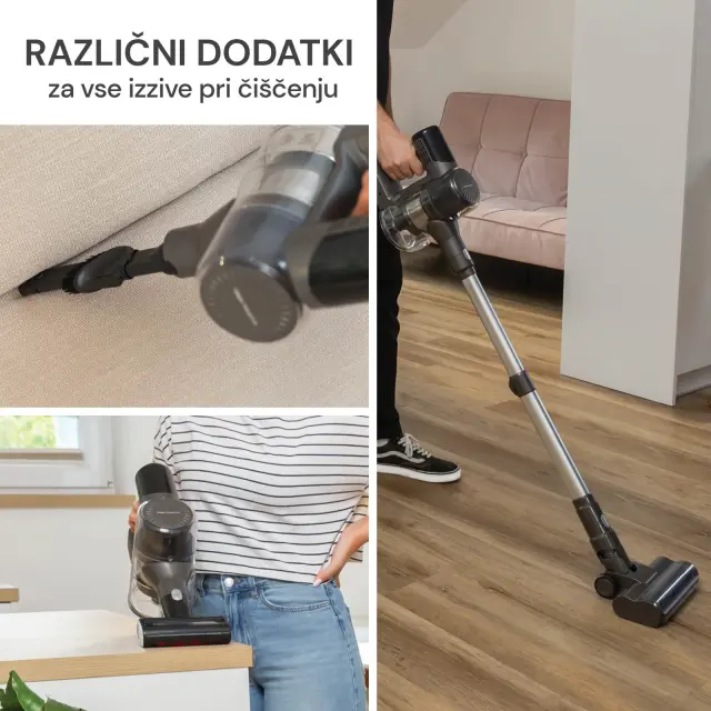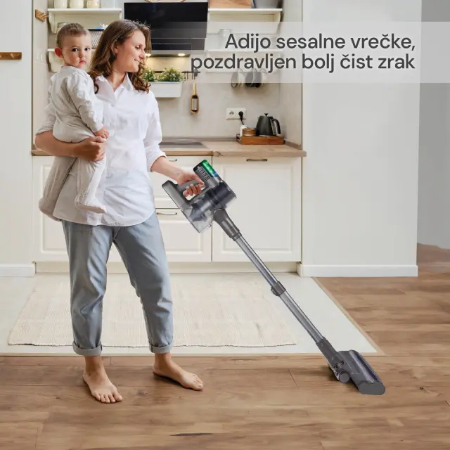 Izberi vsestranski brezžični sesalnik V15 PRO, ki ti bo enostavno pomagal do bleščečih kotičkov v svojem domu. S svojim inovativnim dizajnom ti omogoča, da ga iz pokončnega v ročnega spremeniš v trenutku. Poslovi se od nadležnih kablov in dosezi vsak kotiček brez omejitev, pri čemer ti pomagajo tudi dodatki. Turbo krtača za oblazinjeno pohištvo in cev za sesanje rež, špranj in kotov na višini. Naj te navduši ciklonska tehnologija s hepa filtrom, ki ujame do 99,99 % prahu in alergenov. Nič več menjavanja vrečk, preprosto izprazni posodo za prah in nadaljuj s čiščenjem. Ko je sesanje končano, pa ga preprosto obesiš na stenski nosilec in tako prihraniš dragoceni talni prostor ter si zagotoviš hiter in udoben dostop do sesalnika, kadarkoli in kjerkoli ga potrebuješ.