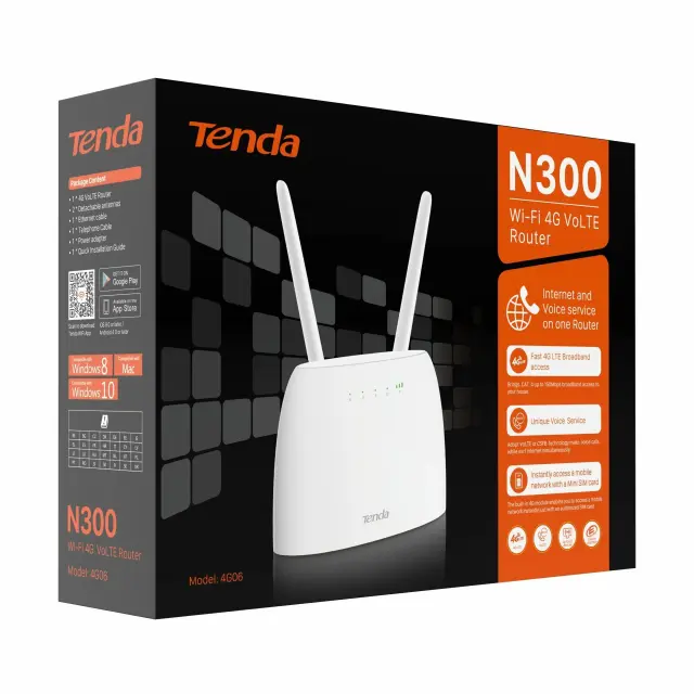 1x Usmerjevalnik LTE Tenda, 1x Mrežni kabel, 1x Napajalnik, 1x Telefonski kabel, 1x Navodila