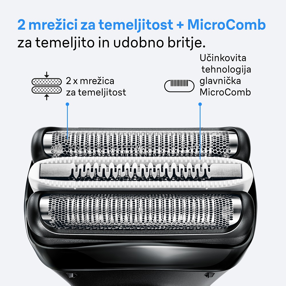 UČINKOVITA TEHNOLOGIJA GLAVNIČKA MICROCOMB: Poseben glavniček ujame več dlak v vsaki potezi in tako zagotavlja hitrejše in nežnejše britje (V primerjavi z brivnikom Braun Series 3. Testirano na tridnevni bradi.)