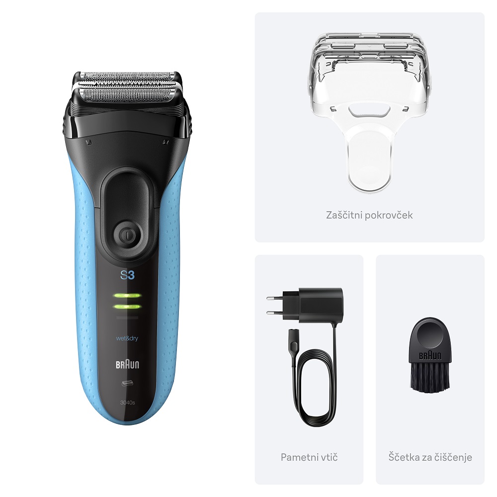 Električni brivnik z mrežico Braun Series 3+ 3040s: za temeljito in udobno britje. Električni brivnik Series 3+ za moške je opremljen z dvema Braunovima brivnima mrežicama in enim sredinskim prirezovalnikom. Fleksibilna rezila se prilagajajo konturam za preprosto britje na katerem koli predelu obraza. Učinkovita tehnologija glavnička MicroComb ujame več dlak v eni potezi* za hitrejše in nežnejše britje. Natančni prirezovalnik, ki natančno oblikuje robove zalizcev ali brkov. Ozka brivna glava za enostavno britje tudi na težko dostopnih mestih, kot je območje pod nosom. 100-odstotno vodoodporen za mokro in suho uporabo. Izdelano v Nemčiji.