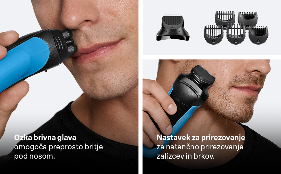 Električni brivnik z mrežico Braun Series 3 310BT: za temeljito in gladko britje. Električni brivnik Series 3 za moške je opremljen z dvema Braunovima brivnima mrežicama in enim sredinskim prirezovalnikom. Fleksibilna rezila se prilagajajo konturam za preprosto britje na katerem koli predelu obraza.Glava za prirezovanje brade, ki omogoča natančno oblikovanje robov zalizcev ali brkov. Ozka brivna glava za enostavno britje tudi na težko dostopnih mestih, kot je območje pod nosom. 100-odstotno vodoodporen za mokro in suho uporabo. Razvit v Nemčiji.