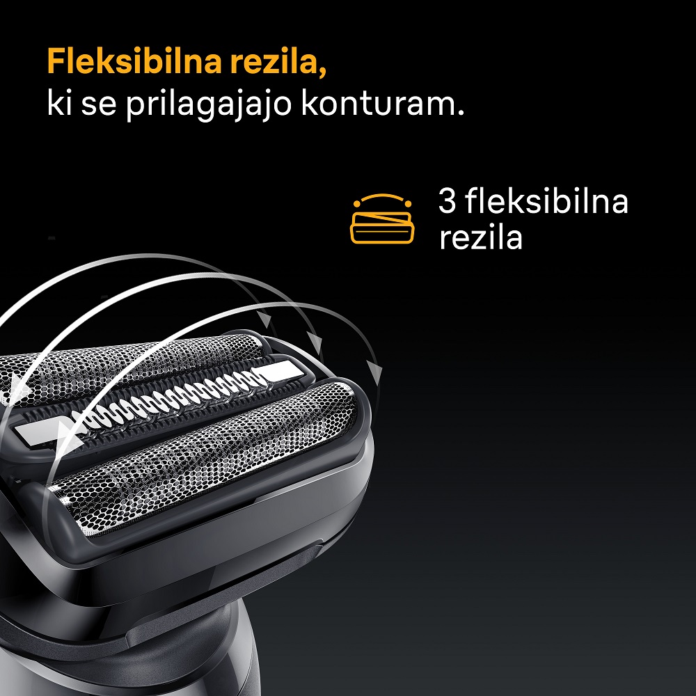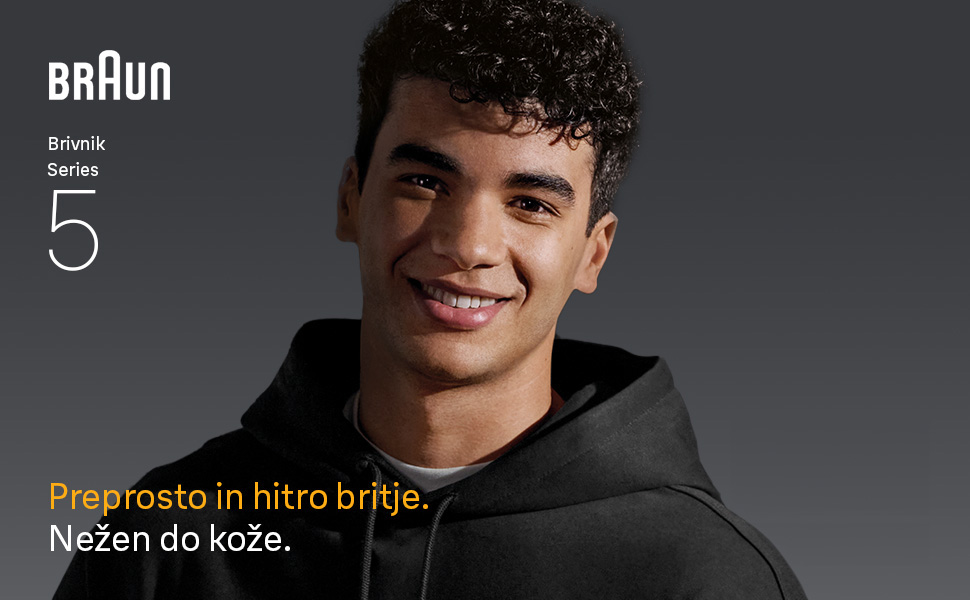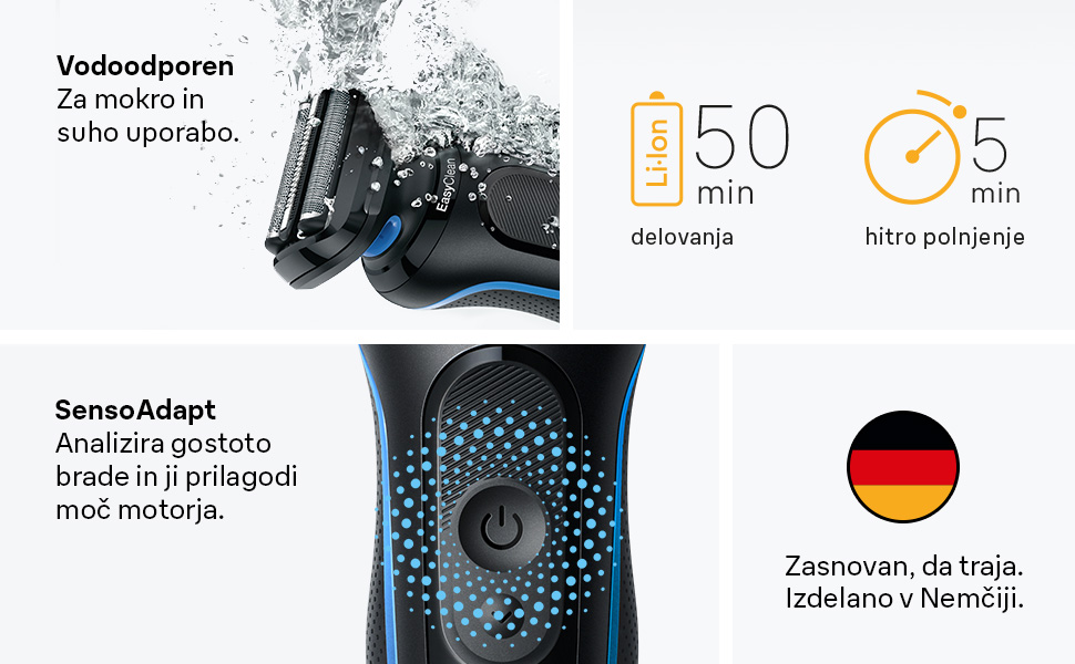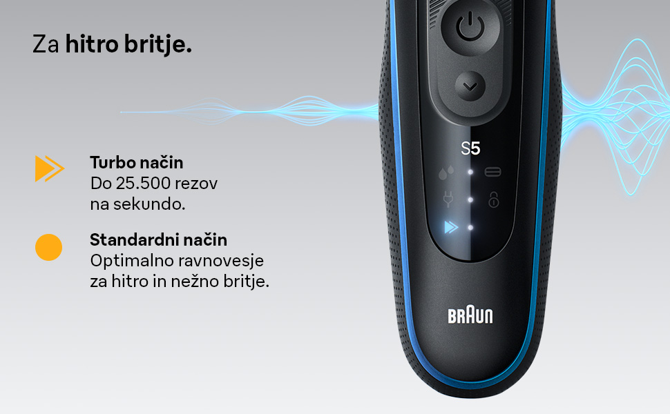 Električni brivnik Braun Series 5 za moške omogoča enostavno in hitro britje. Tri fleksibilna rezila se udobno prilagajajo konturam vašega obraza. Načina britja – turbo in standardni način – vam omogočata prilagoditev britja vašim potrebam. Brivnik je vodoodporen in primeren za mokro in suho uporabo. Opremljen je z Li-ion baterijo, ki omogoča 60 minut delovanja in 5-minutno hitro polnjenje. Vsebina škatle: 1 x črn električni brivnik Series 5 za moške z modrimi poudarki, 1 x polnilnik, 1 x ščetka za čiščenje