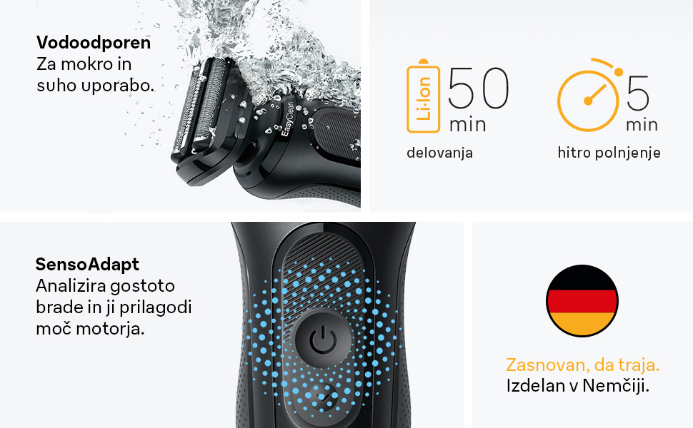 Električni brivnik Braun Series 5 za moške omogoča enostavno in hitro britje. Tri fleksibilna rezila se udobno prilagajajo konturam vašega obraza. Načina britja – turbo in standardni način – vam omogočata prilagoditev britja vašim potrebam. Brivnik je vodoodporen in primeren za mokro in suho uporabo. Opremljen je z Li-ion baterijo, ki omogoča 60 minut delovanja in 5-minutno hitro polnjenje. Vsebina škatle: 1 x črn električni brivnik Series 5 za moške, 1 x nastavek za natančno prirezovanje, 1 x polnilnik, 1 x ščetka za čiščenje