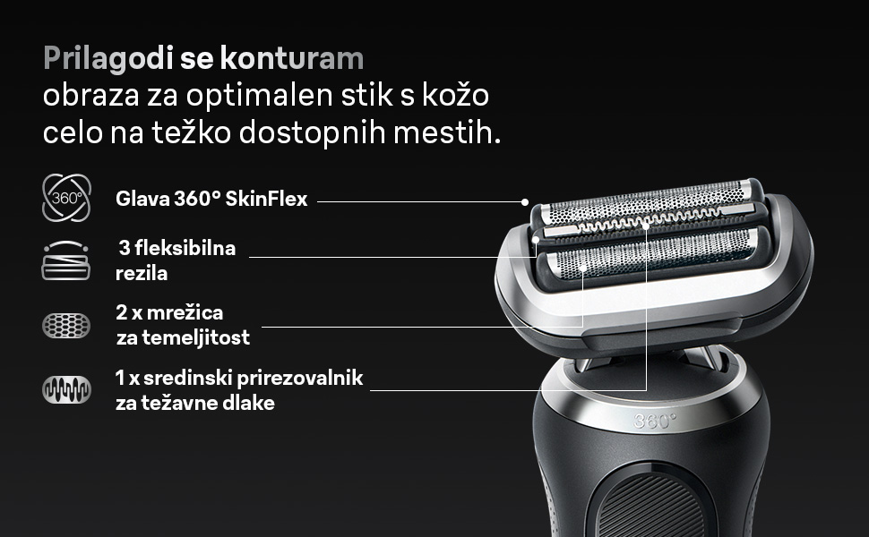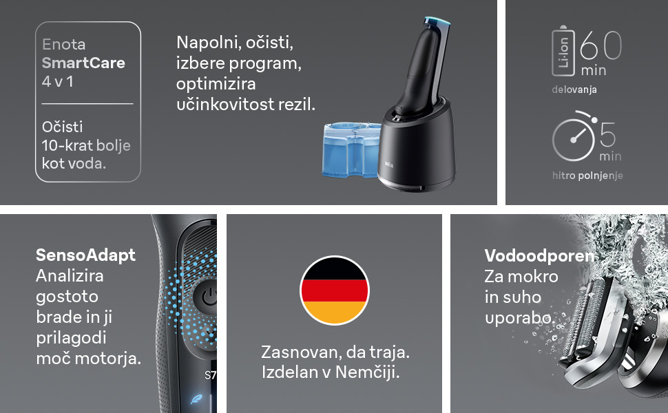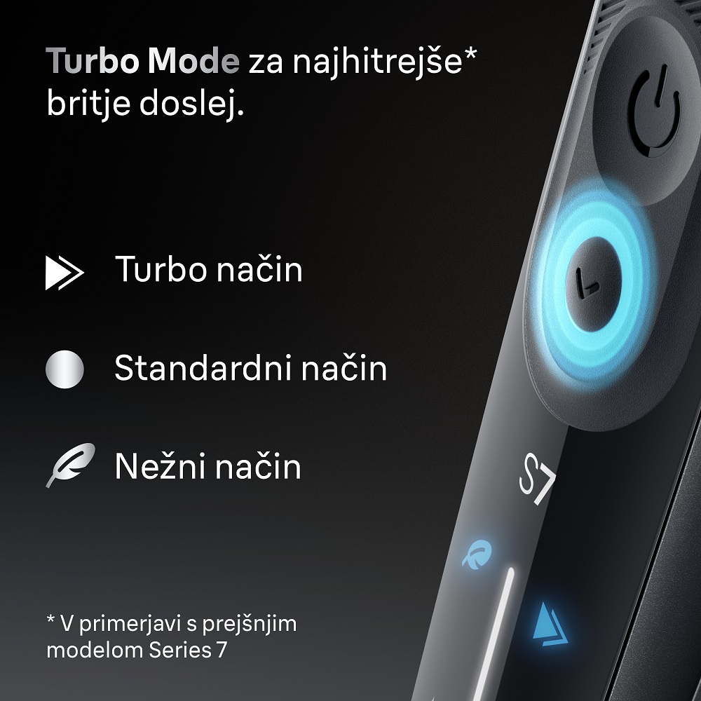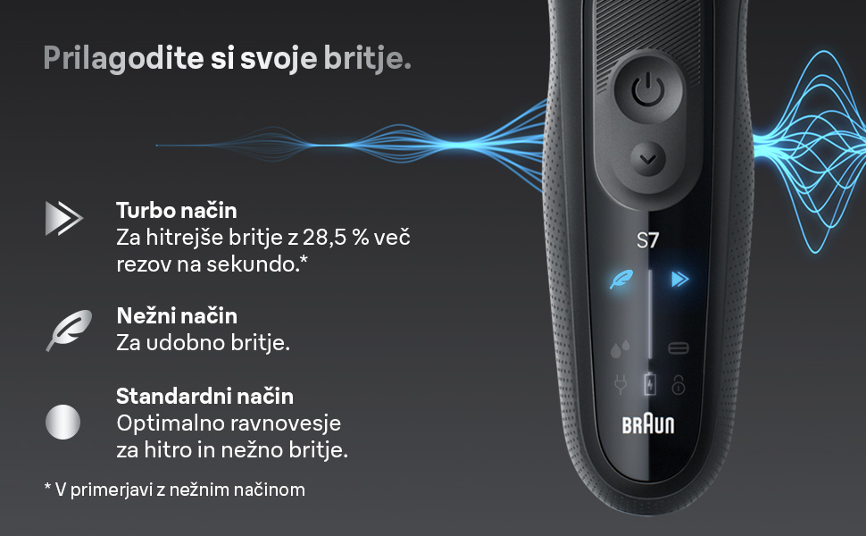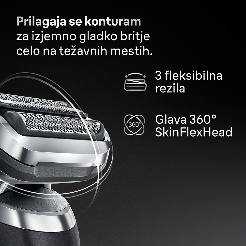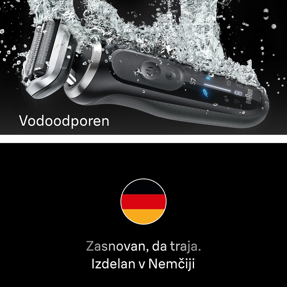 Električni brivnik Braun Series 7 za moške omogoča najtemeljitejše in najhitrejše britje doslej. Glava 360° SkinFlex se prilagaja konturam za izjemno gladko obrito kožo. Načini britja, ki vključujejo turbo, nežni in standardni način, vam omogočajo prilagoditev britja vašim potrebam. Brivnik je vodoodporen in primeren za mokro in suho uporabo. Opremljen je z Li-ion baterijo, ki omogoča 60 minut delovanja in 5-minutno hitro polnjenje. Vsebina škatle: 1 x črn električni brivnik Series 7 za moške, 1 x stojalo za polnjenje, 1 x nastavek za natančno prirezovanje, 1 x potovalni etui, 1 x polnilnik, 1 x ščetka za čiščenje * v primerjavi s prejšnjim modelom Series 7