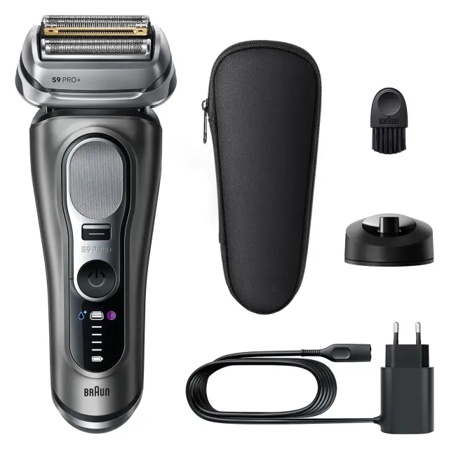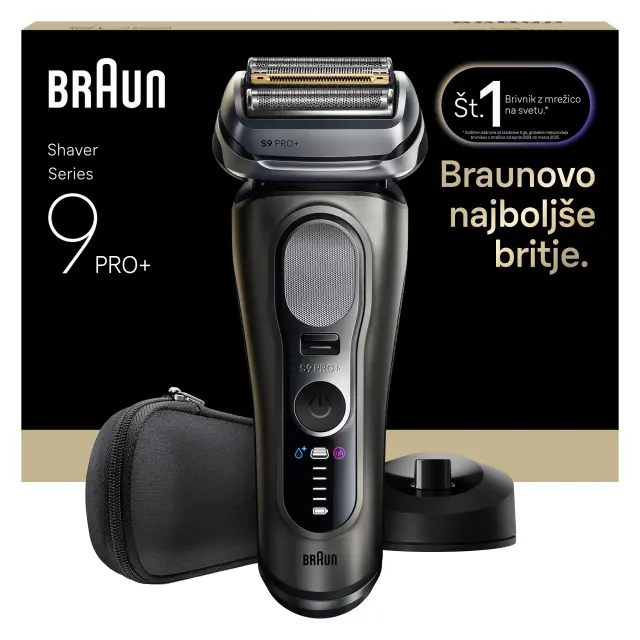 Električni brivnik Braun Series 9 PRO+: zasnovan za moške, da dosežejo popolno gladkost in zaščito kože. Ultra tanka natančna rezila zagotavljajo vrhunsko britje. 5+1 tehnologija popolno sinhronizira rezilo Direct&Cut, prirezovalnik ProTrimmer, mrežico OptiFoil, ki drsi po koži, zaščito SkinGuard in rezilo ProLift s titanovo prevleko. Pro SensoAdapt analizira gostoto brade 300-krat na sekundo in ji samodejno prilagodi moč britja. Brivnik Series 9 PRO+ je 100-odstotno vodoodporen. Izdelano v Nemčiji.