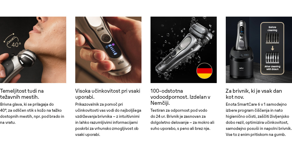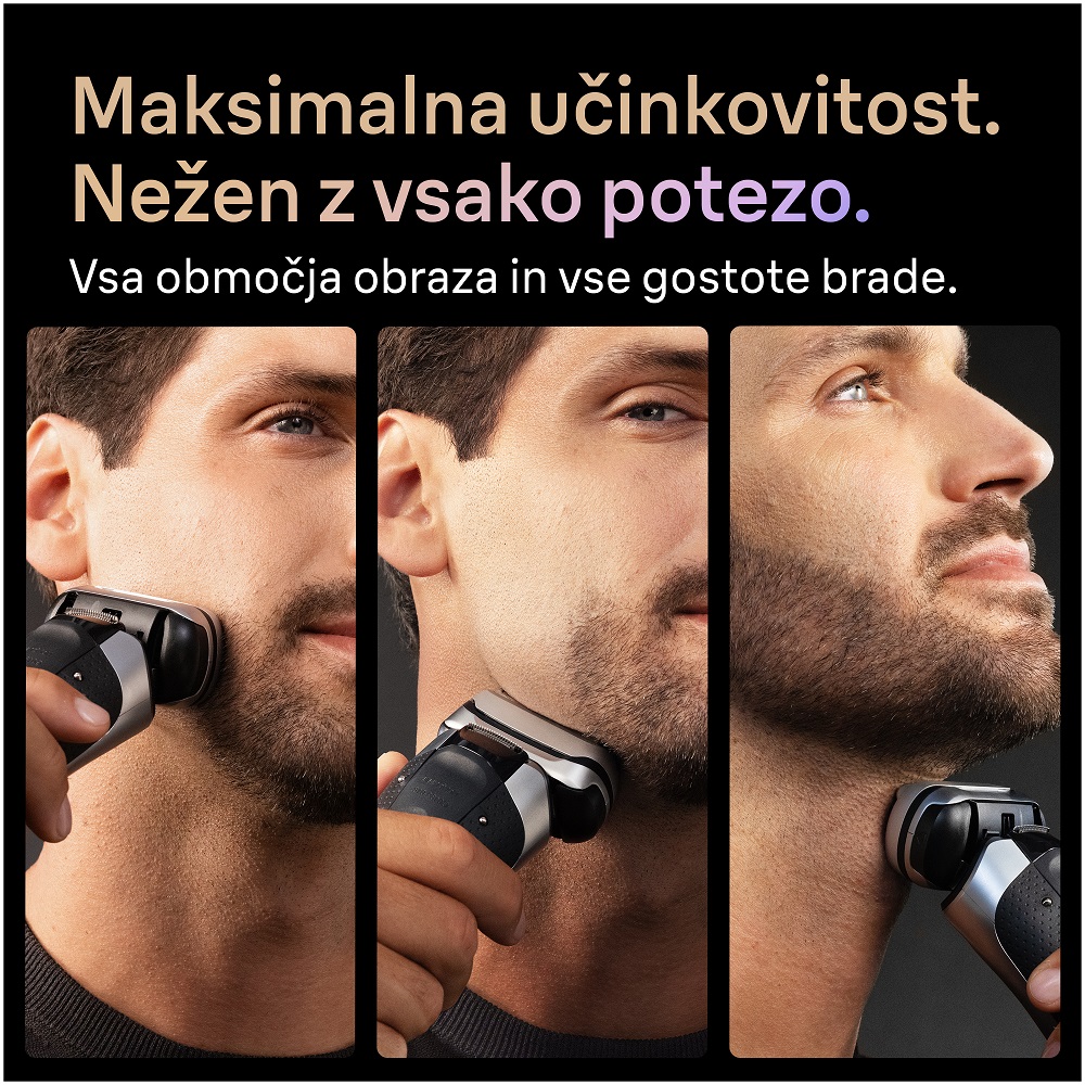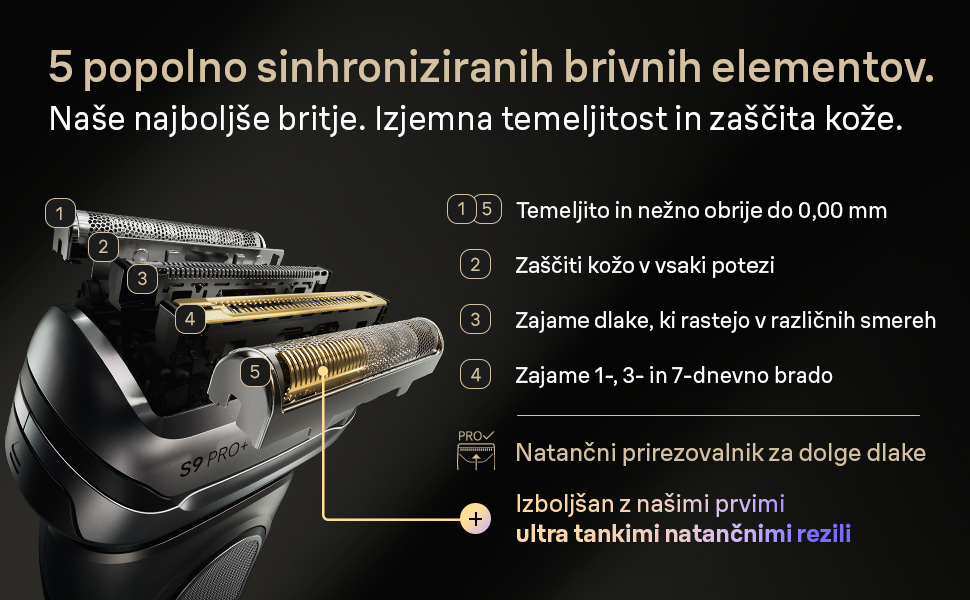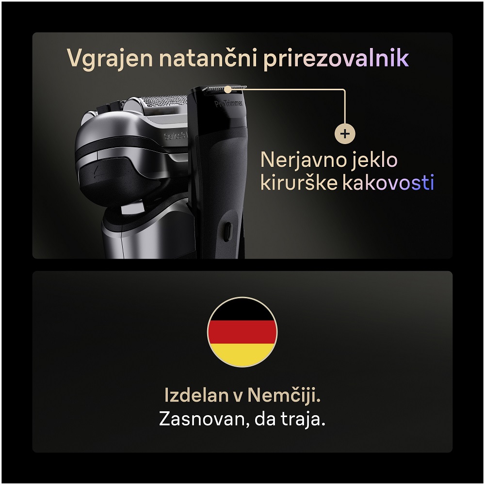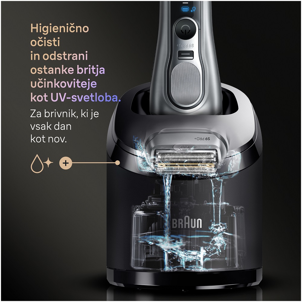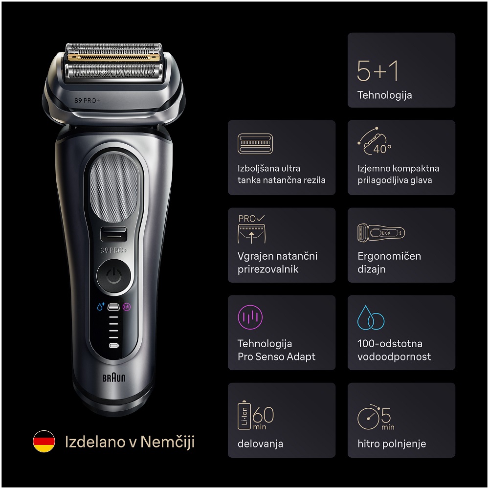 Električni brivnik Braun Series 9 PRO+: zasnovan za moške, da dosežejo popolno gladkost in zaščito kože. Ultra tanka natančna rezila zagotavljajo vrhunsko britje. 5+1 tehnologija popolno sinhronizira rezilo Direct&Cut, prirezovalnik ProTrimmer, mrežico OptiFoil, ki drsi po koži, zaščito SkinGuard in rezilo ProLift s titanovo prevleko. Pro SensoAdapt analizira gostoto brade 300-krat na sekundo in ji samodejno prilagodi moč britja. Enota SmartCare 6 v 1, optimizirana z izbiro avtomatskega programa, očisti, posuši in napolni brivnik ter zaščiti življenjsko dobo rezil in ohranja učinkovitost brivnika. Brivnik Series 9 PRO+ je 100-odstotno vodoodporen. Izdelano v Nemčiji.