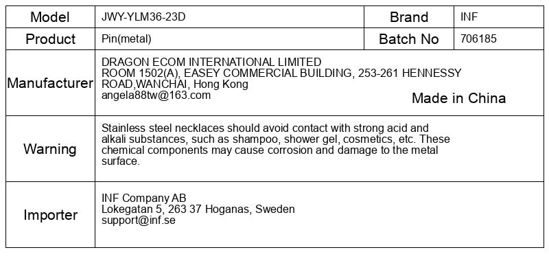 Ogrlice iz nerjavečega jekla se morajo izogibati stiku z močnimi kislinami in alkalnimi snovmi, kot so šamponi, geli za tuširanje, kozmetika itd. Te kemične komponente lahko povzročijo korozijo in poškodbe kovinske površine.