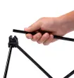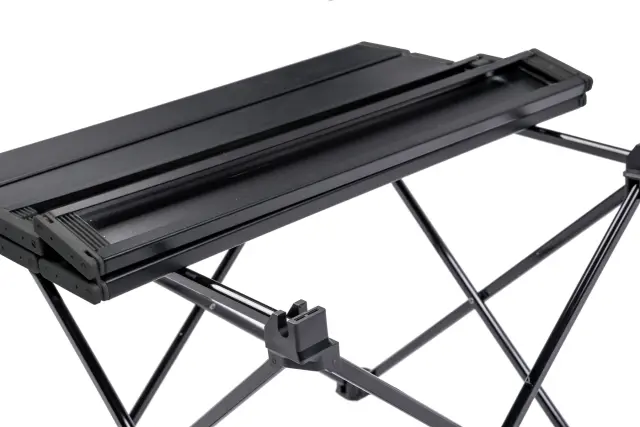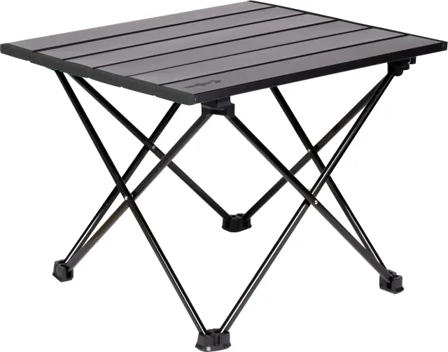 Kompaktna stranska mizica s stabilnim kotalnim vrhom iz lakiranega aluminija. Zložljiv jeklen okvir. Večnamenska uporaba. Z vrečko za pakiranje.