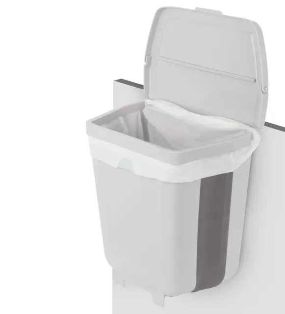 Ročno odpirajoč koš za smeti s pokrovom, ki ima obliko Fold-Away, ki zmanjša prostornino za več kot 50 %, ko ga ne uporabljate. Telo je izdelano iz trpežnega termoplastičnega materiala s trakom iz TPR. Uporablja se lahko kot prostostoječi talni koš ali pa se obesi na steno, vrata ali vrata.