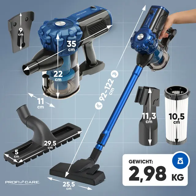 Sesalnik BS 3133 podjetja ProfiCare združuje funkcije ročnega sesalnika in klasičnega sesalnika za tla. Z enim samim klikom se iz talnega sesalnika prelevi v ročnega. Primeren je za vse površine, zato ga lahko uporabljate ne le za sesanje tal, temveč tudi kavčev, avtomobilov in preprog. Ima motor z močjo 600 W. Filtrirni sistem Eco-Cyclon, ki vključuje filter HEPA in mikrofilter. Moč je mogoče nastaviti v dveh stopnjah. Koristna tehnologija je uporaba tehnologije brez vrečk, ki prihrani prihodnje stroške, zato ni treba kupovati včasih po nepotrebnem dragih vrečk. Sesalna cev je izdelana iz aluminija in je nastavljiva po višini. Za čim manj omejitev pri sesanju je sesalnik opremljen z izjemno dolgim napajalnim kablom, dolgim 6,8 m. Tako lahko brez težav sesate na primer stopnišča. Dolžina teleskopske cevi je nastavljiva od 47-77 cm. Prednost je tudi nizka teža, zato je primeren tudi za ženske. Za varčevanje s prostorom boste v paketu našli tudi stenski nosilec. Poleg tega so vam na voljo še krtača, šoba za razpoke in krtača za trda tla. Napajanje je 220-240 V, 50/60 Hz.