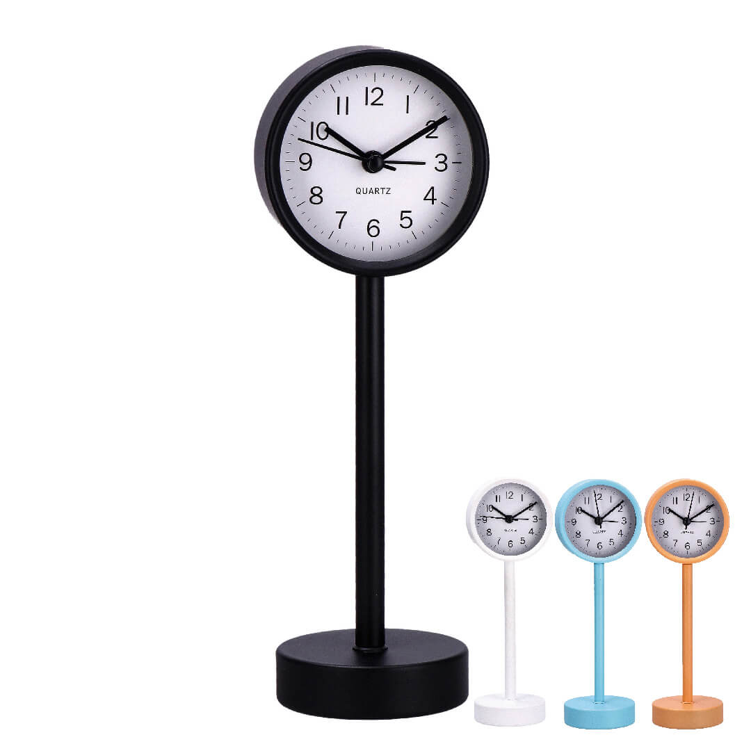 Elegantna železna budilka na podstavku združuje minimalističen dizajn in funkcionalnost. S premerom 7,5 cm in višino 22,5 cm je popoln dodatek za nočno omarico, pisalno mizo ali polico. Okrogel okvir budilke, ki stoji na vitkem stojalu s stabilnim podstavkom, prinaša pridih retro stila, hkrati pa ostaja dovolj nevtralen za vsak interier. Na voljo je v različnih barvah, s kontrastno analogno številčnico za jasno berljivost. Idealna izbira za tiste, ki cenijo kombinacijo preprostosti in estetike. Deluje na baterijo 1 x AA 1,5 V, ki ni priložena.