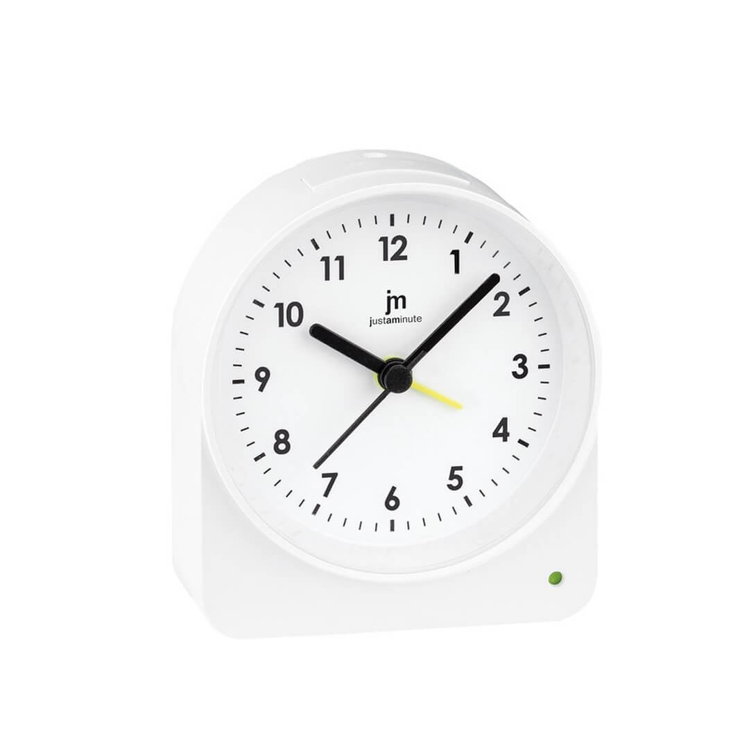 Analogna kvarčna budilka JA7104B ima funkcijo dremeža z možnostjo nastavitve bujenja s 5 minutnim zamikom ter zvonjenje z naraščajočo glasnostjo (crescendo). Z Bip bip melodijo ponuja zanesljivo in diskretno bujenje vsako jutro. Ponaša se s samodejnim senzorjem za osvetlitev zaslona v beli barvi, ko okolica postane temna (možnost izklopa). Moderno zasnovano plastično ohišje in številčnica z arabskimi številkami sta bele barve. Deluje na baterijo 1 x AA (1,5 V), ki ni priložena.