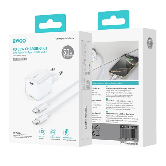 Ta polnilnik hitro polni s 30 W moči in tehnologijo Power Delivery. Za optimalno združljivost je priložen kabel USB-C z USB-C 60W. Tehnologija GaN za večjo učinkovitost in varnost. Kompakten in lahek za enostaven transport.
