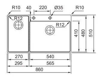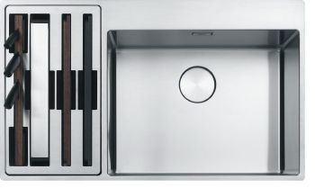 Model: BWX 220-54-27 A Omarica: 90 cm Dimenzije: 860 x 510 mm Izrez: 840 x 490 mm (R = 10 mm) Velikost posode: 540 /410 /200 + 270 /480 /200 mm Vgradnja/namestitev: Slim Top ali ploskovgradna Material: polirano nerjaveče jeklo Ventil: ekscenter PopUp ventil in ročno Regulacija ventila: potisni gumb iz nerjavečega jekla ali ročno Preliv: integriran preliv s pokrivno ploščico Izvrtina za armaturo: 2x 35 mm izvrtina za armaturo in gumb Delovna plošca: minimalna debelina 12 mm Vključeno v setu: 7 dodatkov Izdelek je sestavljen iz 2 paketov (št.artikla): - Velika posoda desno 127.0558.824 = 127.0543.037 + 112.0544.226
