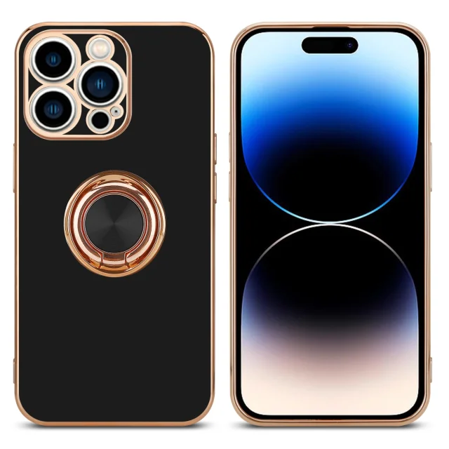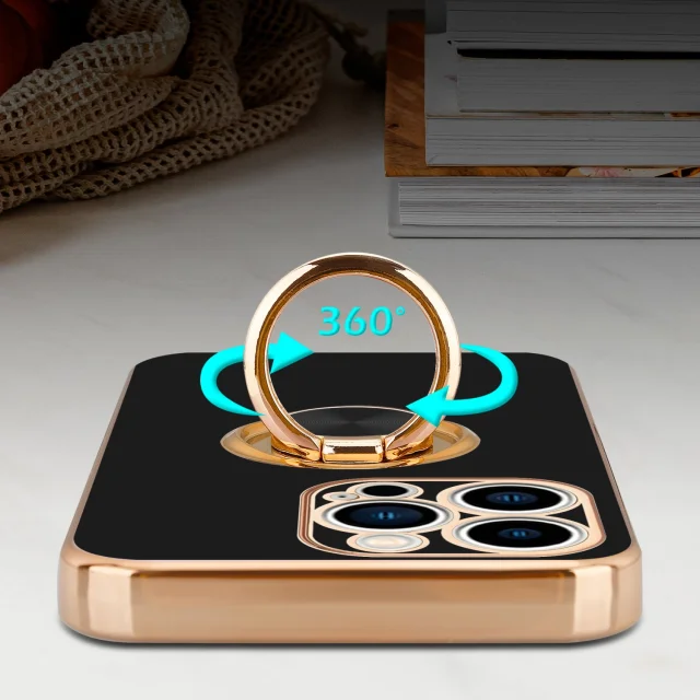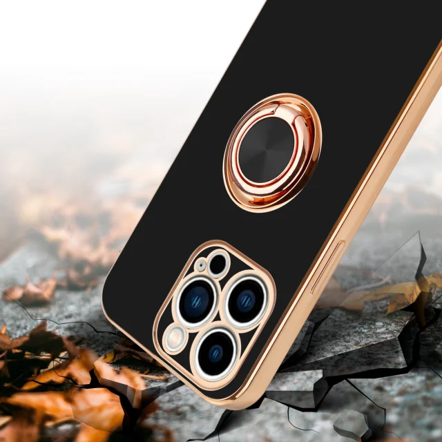 CADORABO Apple v sijajnem črni barvi - zlato z obročem silikonski/TPU ovitek z zaščito pred kamero in držalom magnetnega avtomobila