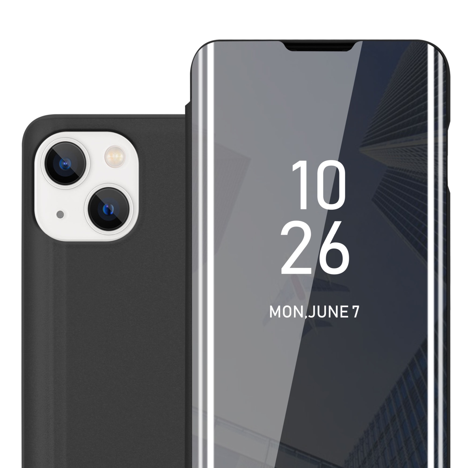 CADORABO CASE, združljiv z Apple v turmalinski črni barvi - Clear View Zrcalo Zaščitni pokrov s funkcijo stojala 360 stopinj zaščita