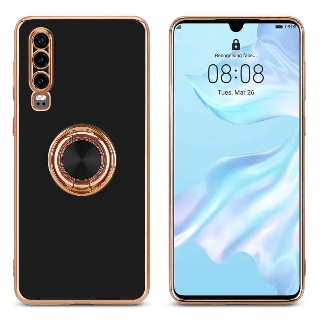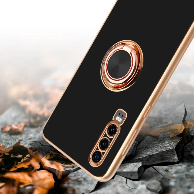 CADORABO Huawei v sijajnem črni barvi - Zlato z obročem silikonski/TPU ovitek z zaščito pred kamero in držalo magnetnega avtomobila