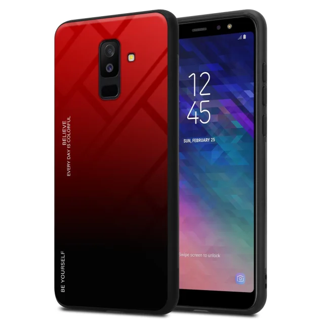 CADORABO Ohišje, združljiv s Samsungom v rdeči barvi - črni - dvobarvni zaščitni pokrov iz silikona TPU in hrbta iz kaljenega stekla