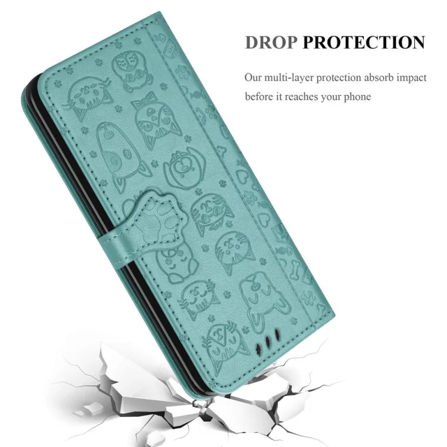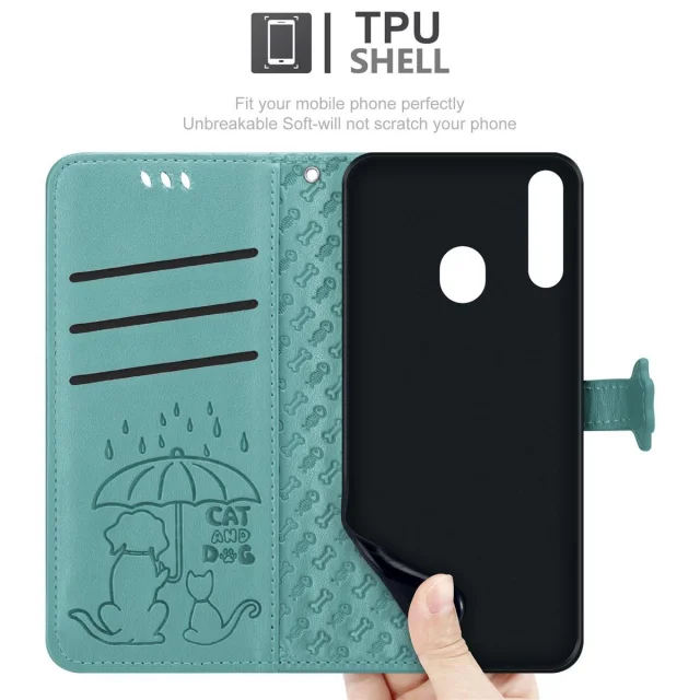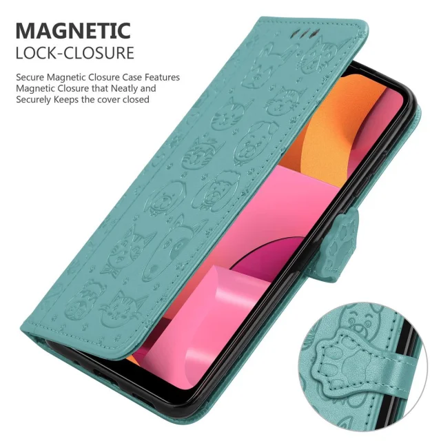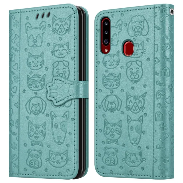 Cadorabo Ohišje, združljivo z Samsung Galaxy A20s v bleščeča zelena - Simpatični psi in mačke, zaščitni ovitek s funkcijo stojala in režami za kartice