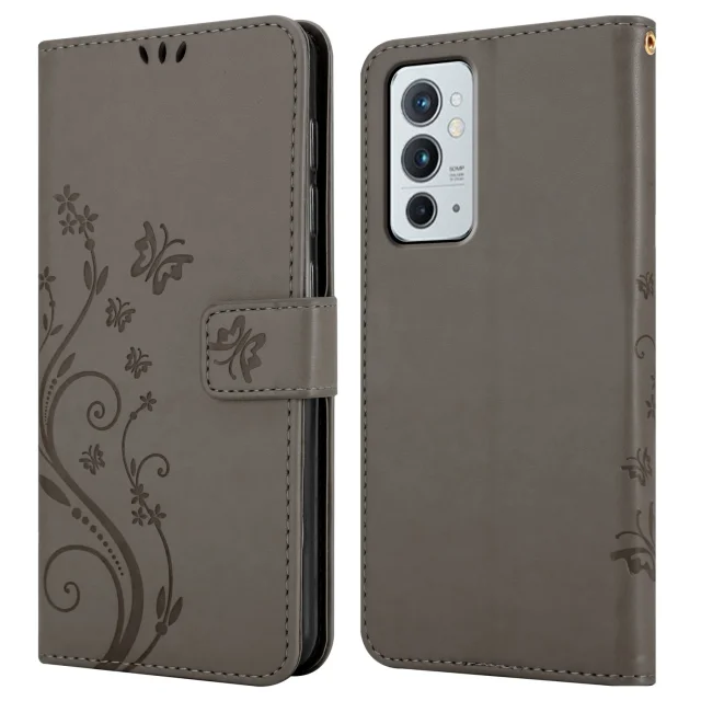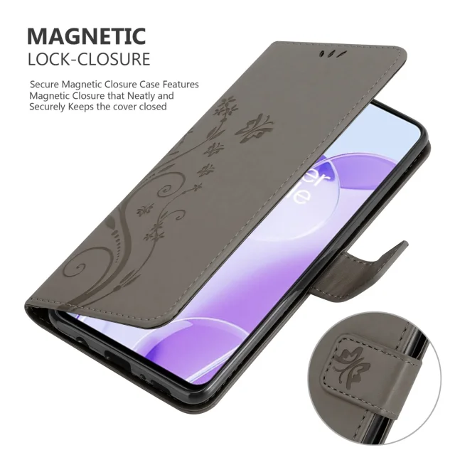 CADORABO OnePlus v cvetlični sivi barvi - zaščitni pokrov pri oblikovanju cvetja z magnetnim zapiranjem, stoječimi funkcijami in režami za kartice