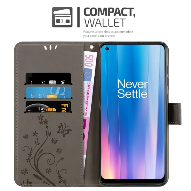 CADORABO OnePlus v cvetlični sivi barvi - zaščitni pokrov pri oblikovanju cvetja z magnetnim zapiranjem, stoječimi funkcijami in režami za kartice