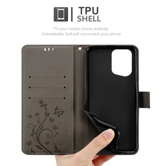 CADORABO OPPO v cvetlični sivi barvi - zaščitni pokrov pri oblikovanju cvetja z magnetnim zapiranjem, stoječimi funkcijami in režami za kartice