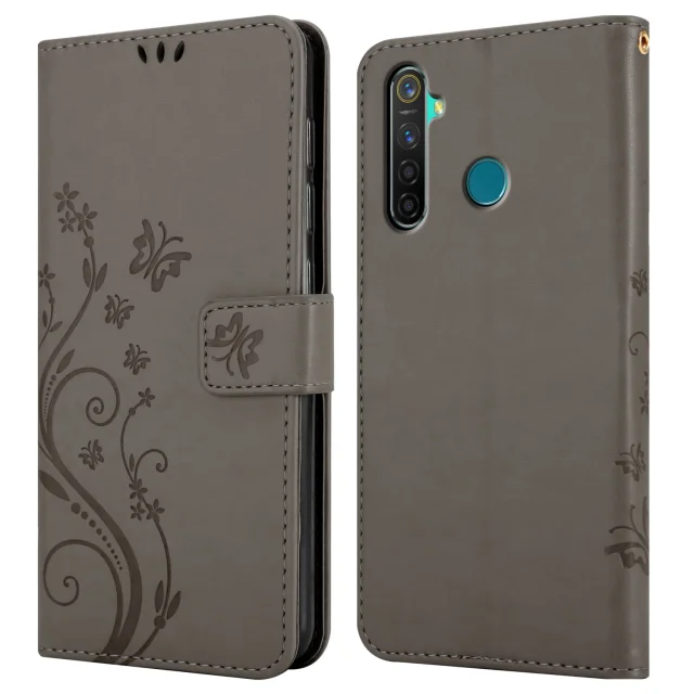 CADORABO Realme v cvetlični sivi barvi - zaščitni pokrov pri oblikovanju cvetja z magnetnim zapiranjem, stoječimi funkcijami in režami za kartice