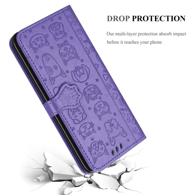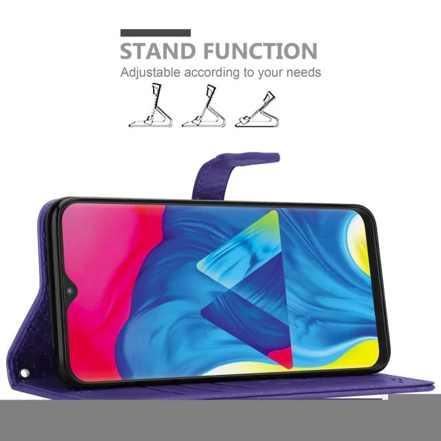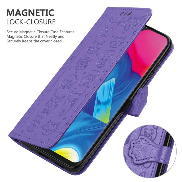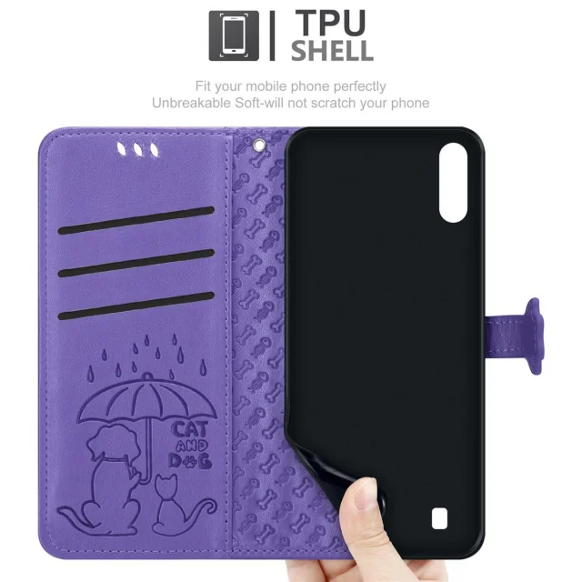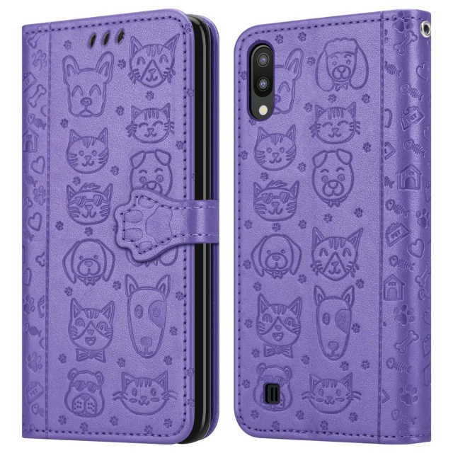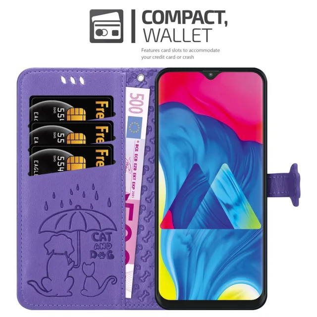 CADORABO Samsung Galaxy A10/M10 v bleščeča vijolična - Simpatični psi in mačke, zaščitni ovitek s funkcijo stojala in režami za kartice
