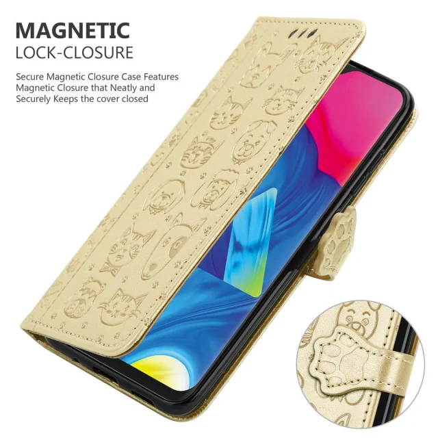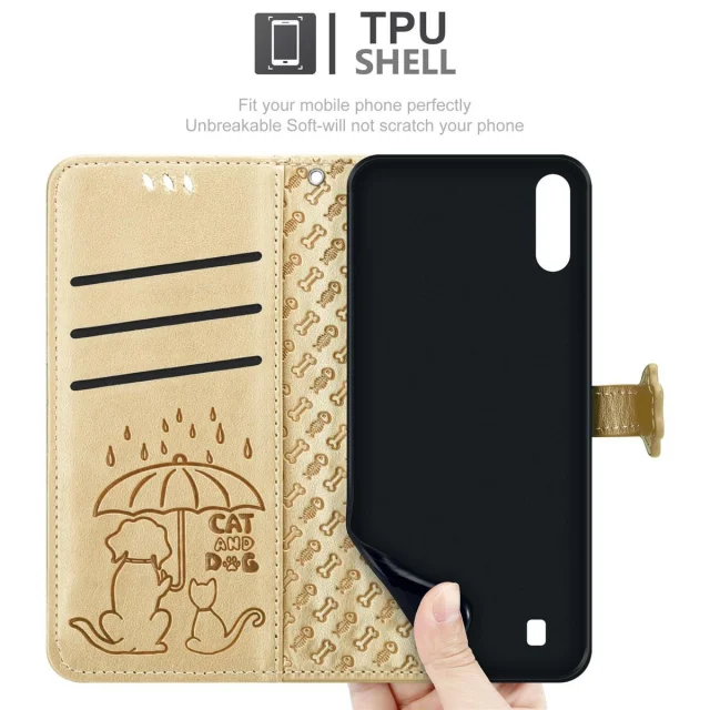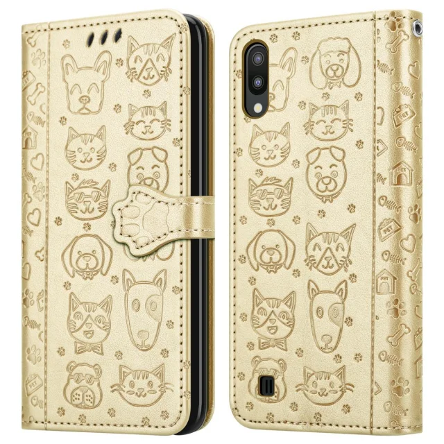 CADORABO Samsung Galaxy A10/M10 v sijajno zlato - Simpatični psi in mačke, zaščitni ovitek s funkcijo stojala in režami za kartice