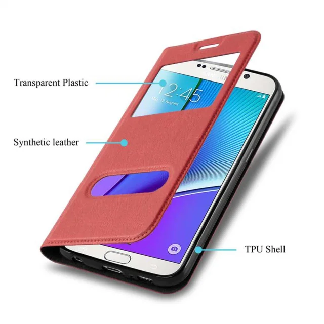 CADORABO Samsung Galaxy NOTE 5 v žafranovo rdeča - Zaščitni ovitek z magnetnim zapiranjem, stoječo funkcijo in 2 okencema za gledanje