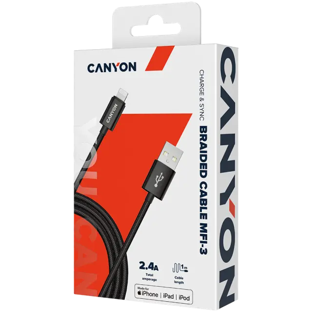 CANYON MFI-3, MFI pleten kabel za polnjenje in sinhronizacijo z kovinsko lupino, USB/lightning, certificiran s strani Apple, dolžina kabla 1m