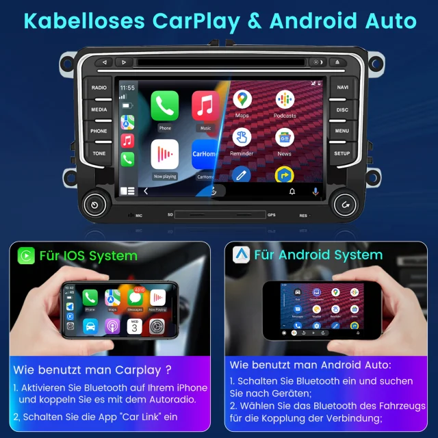 Drahtloses Carplay und Android Auto: Tauchen Sie ein in ein nahtloses und benutzerfreundliches Infotainment-Erlebnis mit Apple CarPlay & Android Auto. Verbinden Sie Ihr iPhone mit Apple CarPlay oder Ihr Android-Smartphone mit Android Auto und greifen Sie sicher auf Anrufe, Textnachrichten, Navigation, Musik und vieles mehr zu. Mit intuitiver Bedienung über den Touchscreen oder Sprachsteuerung haben Sie alle Funktionen bequem zur Hand, während Sie sicher am Steuer bleiben. Nutzen Sie Ihre bevorzugten Apps und bleiben Sie jederzeit verbunden, während Sie den Blick auf die Straße gerichtet haben. Machen Sie Ihr Fahrzeug zu einem erweiterten Hub für Ihre mobilen Geräte und erleben Sie eine neue Dimension des Infotainments.