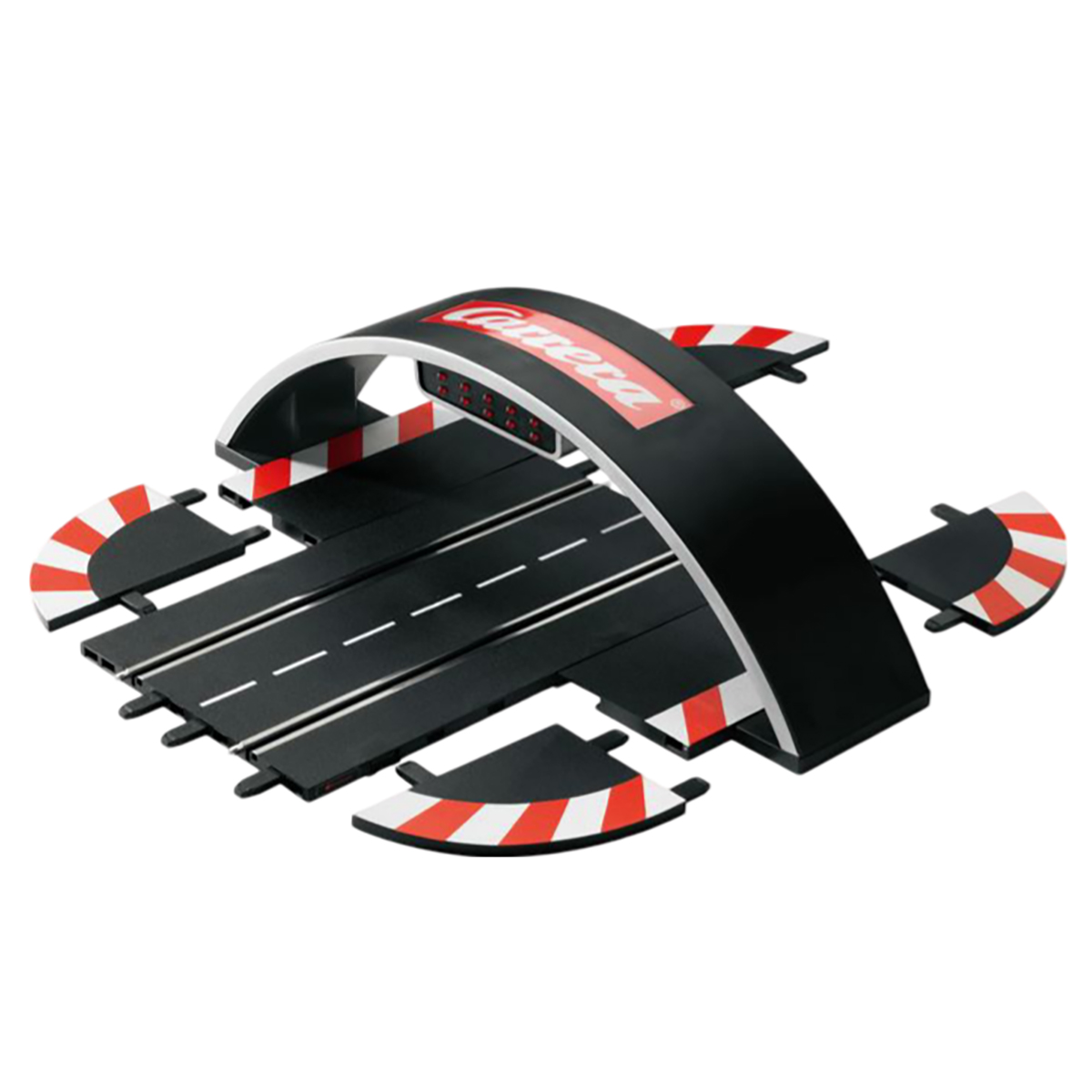S temi dodatki za dirkališče Startlight lahko uživate v vznemirljivi in realistični dirkaški izkušnji.. Svetloba Startlight na začetku dirke signalizira fazo luči, kar doda dinamiko in poveča vznemirjenje.. Pet vrstic diod LED se prižge ena za drugo in ugasne, ko je potrjen začetek dirke, kar ustvari spektakularen učinek začetka dirke.. Logotip Carrera na zgornjem delu luči Startlight se prižge takoj, ko je proga v uporabi, kar zagotavlja dobro vidljivost za vse tekmovalce..