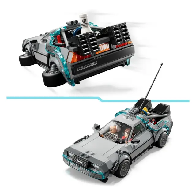 Iz kock sestavljeni avtomobil vključuje številne znane podrobnosti z modela iz filmov. Ikonični avto sestavi s strelovodom in kalifornijsko registrsko tablico iz prvega filma, nato pa ga predelaj v letečo različico z drugega filma z g. Fuzijskim, oranžno registrsko tablico in zasukanimi kolesi. Obe različici imata zadnje zračne odprtine, kabino, fluks-kondenzator in časovni kalkulator.
