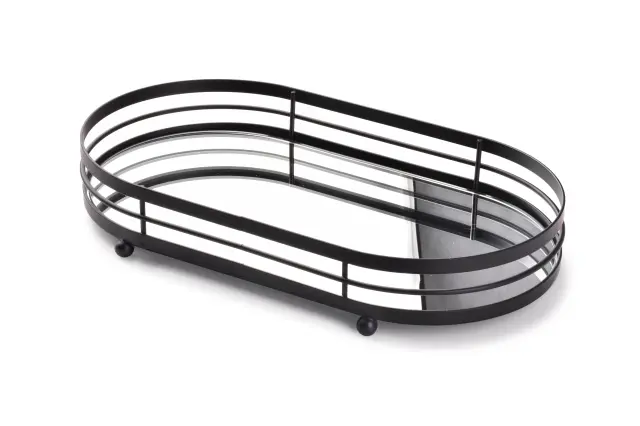 CEDRIC pladenj 33x18,5xh5,5cm ČERNO Ovalni okrasni pladenj Cedric, ki ga ponuja podjetje Mondex, je vrhunska izbira za vse, ki si želijo dodati pridih elegance in sofisticiranosti svojemu prostoru. Izdelan iz kovine in ogledala, ta pladenj očara s svojo estetsko privlačnostjo in funkcionalnostjo. Klasika v črni barvi se izjemno dobro poda v različne notranje stile, bodisi v dnevni sobi bodisi v jedilnici, kar ga naredi središče pozornosti. Zaradi svoje edinstvene zasnove in vrhunskih materialov, je primeren tudi za najzahtevnejše uporabnike, ki cenijo kakovost in slog.Dodatna prednost pladnja Cedric je njegova svestranost. Lahko ga uporabljate kot osrednji del dekoracije, tako da nanj postavite zanimive kompozicije, cvetje ali sveče, s čimer boste dodatno obogatili prostor. Poleg tega je odličen tudi kot stojalo na kopalniškem pultu, kjer lahko predstavljate elegantne razpršilnike za milo ali parfum. Njegova praktična oblika in optimalna velikost (33 x 18,5 x 5,5 cm) omogočata enostavno integracijo v različne prostore in načine uporabe.Teža pladnja je le 834 g, kar ga naredi lahko za prenašanje in premikanje, hkrati pa dovolj stabilno, da zagotavlja varno in zanesljivo postavitev predmetov. Pakiranje enote v elegantni beli kartoni (33 x 19 x 5,5 cm) dodatno poudari njegovo kakovost in omogoča enostavno shranjevanje ter prenašanje. Ovalni pladenj Cedric je tako idealna izbira za vse, ki želijo notranjosti dodati kanček prefinjenosti in originalnosti.