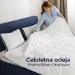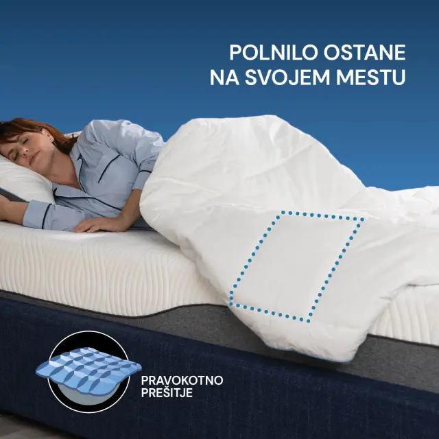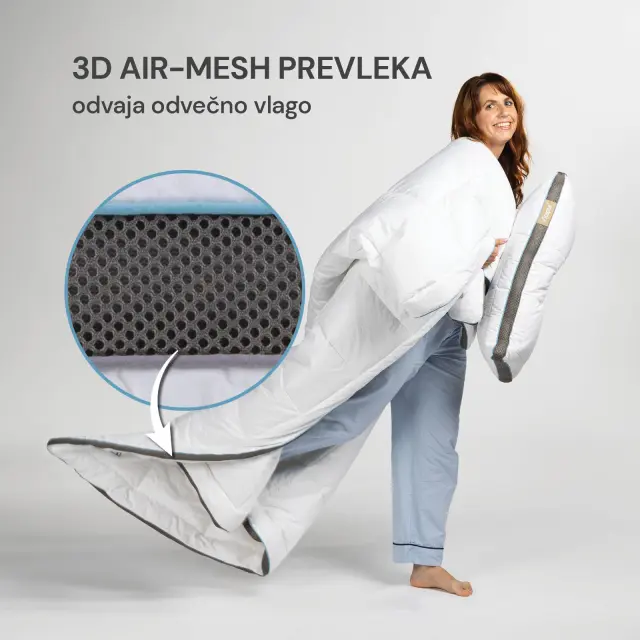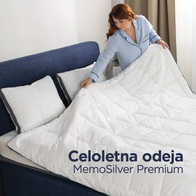 Doživi novo razkošje spanca s hibridno celoletno odejo MemoSilver Premium. Ta inovativna odeja iz premium materialov ti omogoča udoben spanec v suhem in mehkem objemu vsake noči. Bambusova vlakna odlično uravnavajo temperaturo in odvajajo odvečno vlago, zato odeja daje osvežujoče hladen občutek poleti in prijetno topel pozimi. Idealna izbira za vse letne čase. Na drugi strani je sloj posebnih mikrovlaken kot trajnostna, eko-alternativa puhu, ki zagotavlja voluminoznost in prestižen občutek mehkobe. Oba sloja odlikuje premišljeno pravokotno prešitje, ki poskrbi za enakomerno porazdelitev polnila, da odeja ostane kot nova tudi po dolgotrajni uporabi. Odeja MemoSilver Premium je še posebej primerna za ljudi z občutljivo kožo, alergike in astmatike. Prevleka je izdelana iz 100 % naravnega bombaža, ki je znan po svoji odpornosti proti pršicam, zračnosti in mehkobi. Obogatena je tudi s srebrovimi ioni, ki delujejo protibakterijsko, saj zavirajo razmnoževanje bakterij in pršic ter omogočajo čistejši, bolj higieničen stik prevleke s kožo.
