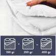 Prevleka The White Stone za vse sezone je sestavljena iz dveh prevlek, ki so opremljene s praktičnimi klipsi, ki omogočajo združevanje za najhladnejše noči. Set vključuje pomladno/poletno prevleko s polnjenjem 150 g/m² in jesensko prevleko s polnjenjem 250 g/m². Obe prevleki imata estetski dizajn s prešivanjem, ki zagotavlja, da hipoalergenska šuplja vlakna ostanejo na svojem mestu ter enakomerno porazdelijo težo in toploto.