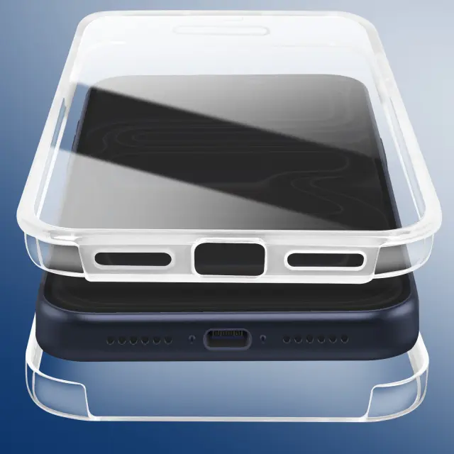 To ohišje ima trdno hrbtno stran iz polikarbonata, odpornega proti udarcem.. Ohišje Full 360 za iPhone 17 Pro Max. Združljiv s funkcijo dotika sprednjega zaslona. Mehki silikonski robovi iz gela za boljši oprijem.