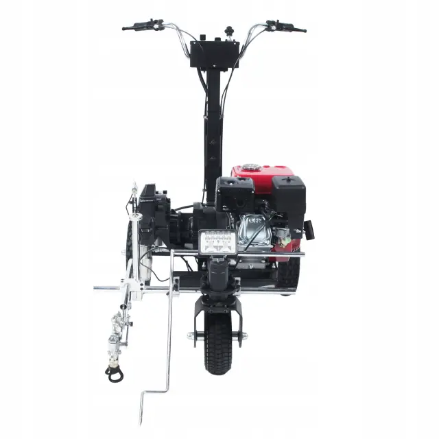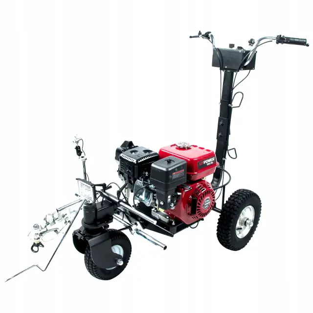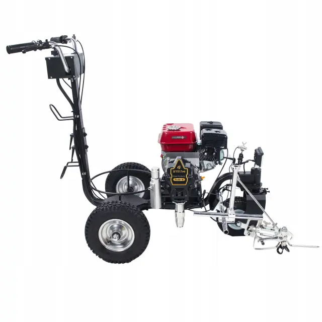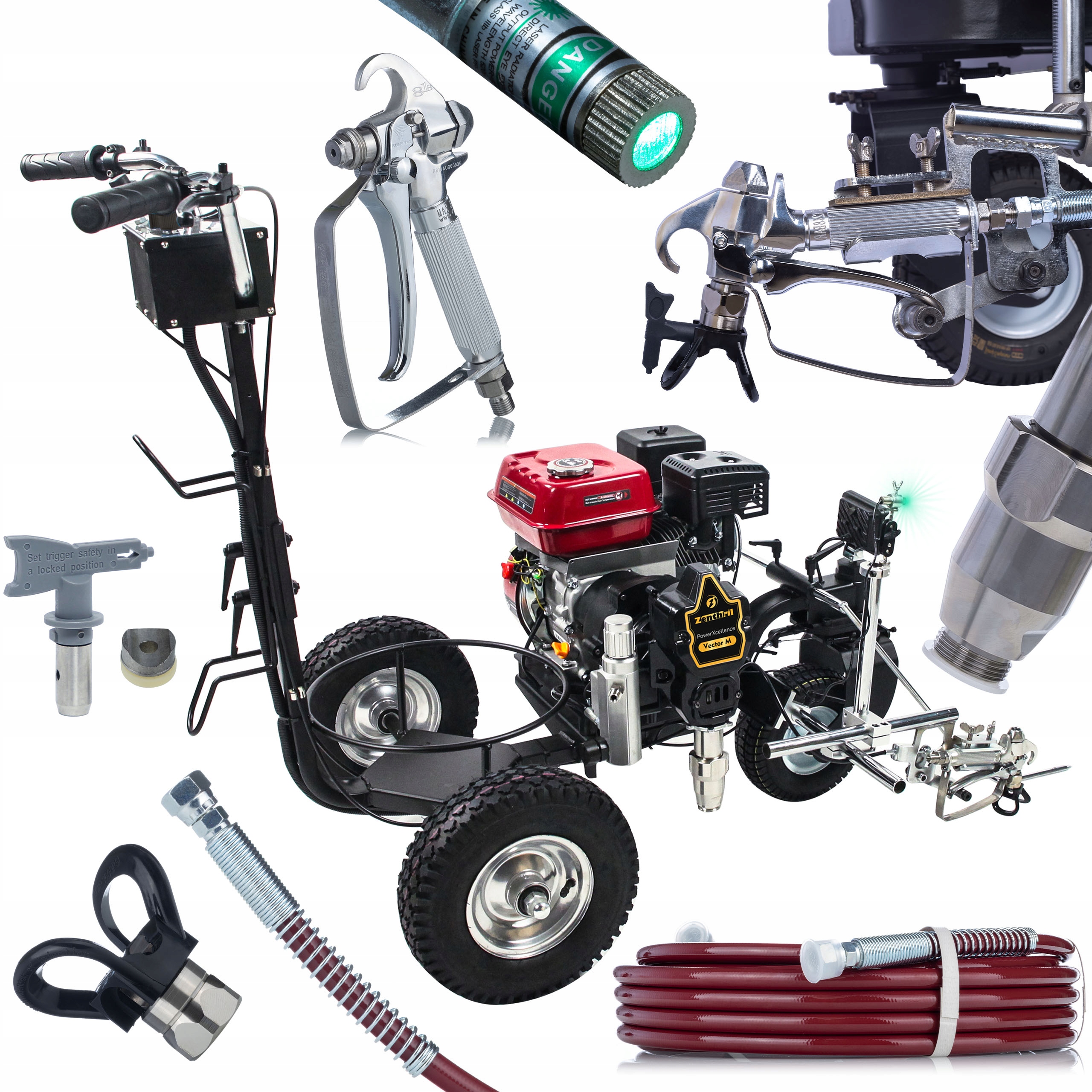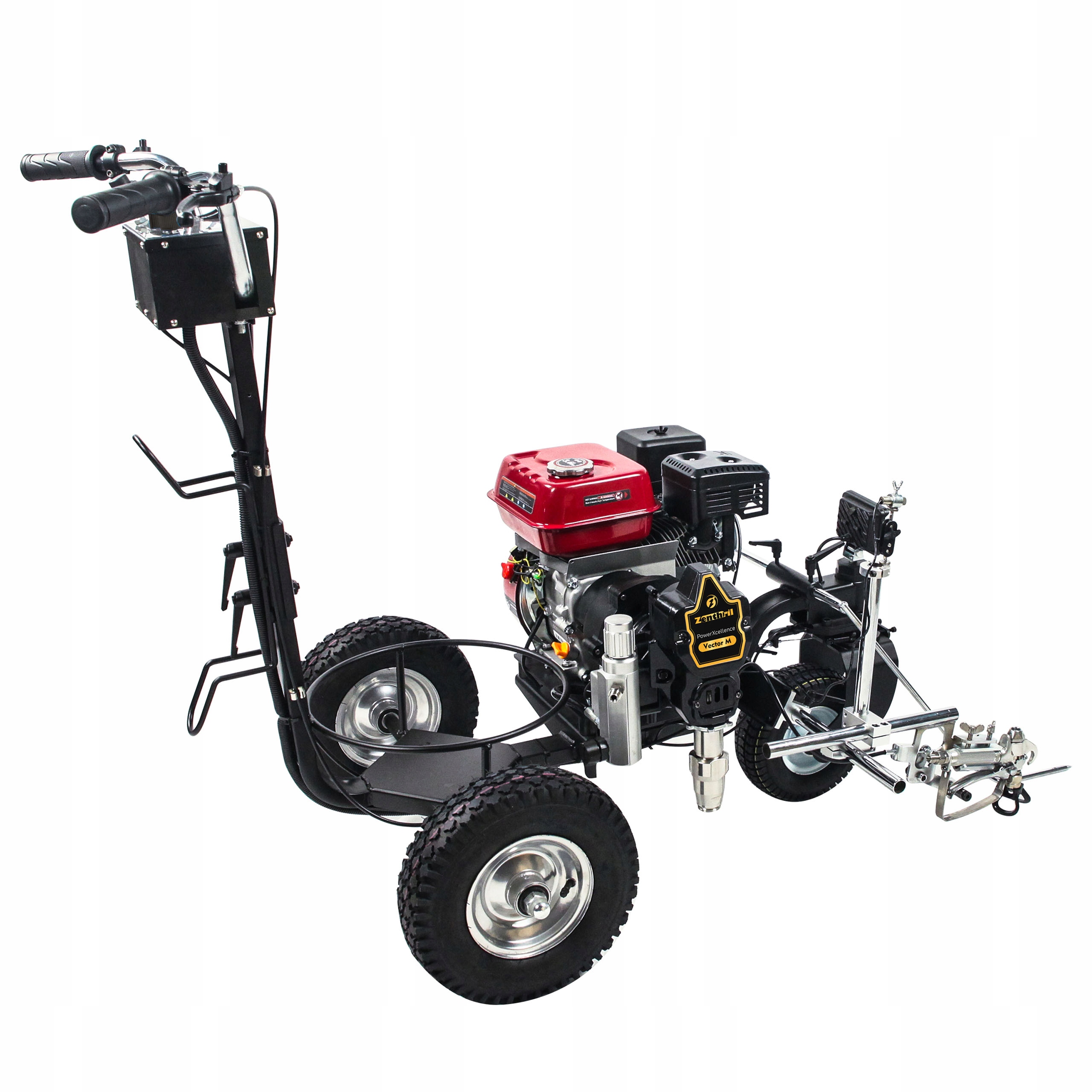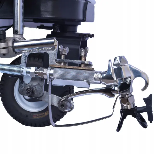 Cestni barvni razpršilnik omogoča pritrditev barvne pištole tako na desni kot na levi strani, kar omogoča prilagoditev individualnim potrebam uporabnika. V kompletu so vsi potrebni elementi za montažo, ki omogočajo natančno nastavitev pištole, kar zagotavlja udobje pri delu in natančnost pri barvanju črt.