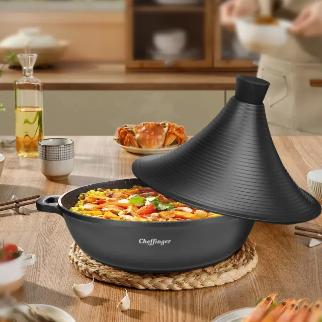 Obloge iz črnega kamna vaši kuhinji dodajo pridih elegance. Visokokakovostna nelepljiva notranjost omogoča kuhanje z malo ali nič dodane maščobe. Značilen stožčast pokrov tagina omogoča kondenzacijo hlapov in vračanje vlage v hrano, ki se počasi kuha in se topi v ustih.. Ročaji so oblikovani tako, da omogočajo udoben in varen oprijem, tudi ko je tagine vroč..