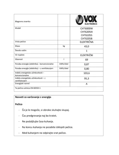 - Poraba električne energije - standardna: 0,87 kWh/ciklus
