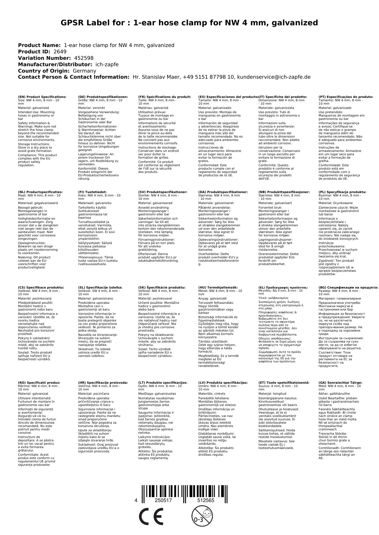 1-Ohr-Schlauchklemme za NW 4 mm, cinkana, predstavlja vrhunsko rešitev za varno in zanesljivo pritrditev cevi z notranjim premerom 8-10 mm. Ta sponka je posebej zasnovana za zahtevne pogoje v profesionalnih okoljih, kot so gostinstvo, bar in industrijske aplikacije, kjer je zanesljivost ključna.