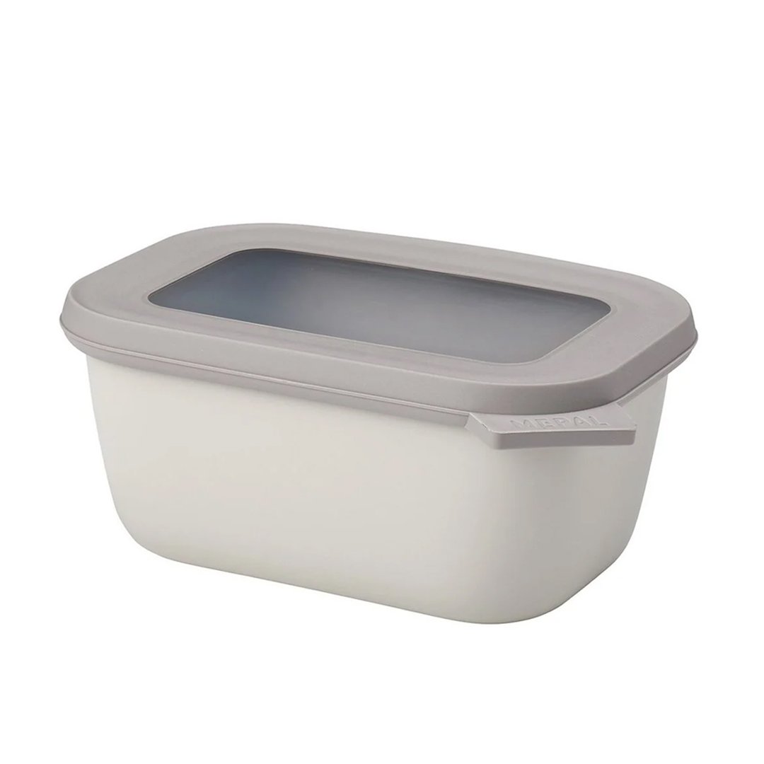 MEPAL CIRQULA (1500 ml) - pravokotna multifunkcionalna skleda s pokrovom v nordijsko beli barvi je popolna za shranjevanje svežih živil ali že pripravljene hrane. Linija »Cirqula« nizozemske blagovne znamke Mepal je zasnovana za popoln »krog uporabe« (ang. circle of use) – od shranjevanja živil v zmrzovalniku in hladilniku, segrevanja hrane v mikrovalovni pečici (brez pokrova), do serviranja neposredno na mizi. Cirqula je narejena iz neuničljivega materiala (brez BPA), prosojno okence na njenem pokrovu pa omogoča vpogled v shranjeno vsebino. Ravno ta inovativen, mehak pokrov omogoča zrakotesno in nepropustno zapiranje brez polivanja. Hrana bo dlje časa ohranjala svežino, skledico pa lahko vzamete tudi s seboj na pot. Mepal Cirqula posodice v različnih velikostih in oblikah so praktične in enostavne za shranjevanje, saj jih lahko postavite eno navrh druge, ko so polne, ali zložite skupaj, ko so prazne. Čiščenje posodic je enostavno, primerne so tudi za pomivalni stroj.