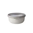 MEPAL CIRQULA (350 ml) - multifunkcionalna skledica s pokrovom v nordijsko beli barvi je popolna posoda za shranjevanje svežih živil ali že pripravljene hrane. Ta velikost je idealna za shranjevanje humusa, omak, otroških prigrizkov … Linija »Cirqula« nizozemske blagovne znamke Mepal je zasnovana za popoln »krog uporabe« (ang. circle of use) – od shranjevanja živil v zmrzovalniku in hladilniku, segrevanja hrane v mikrovalovni pečici (brez pokrova), do serviranja neposredno na mizi. Cirqula je narejena iz neuničljivega materiala (brez BPA), prosojno okence na njenem pokrovu pa omogoča vpogled v shranjeno vsebino. Ravno ta inovativen, mehak pokrov omogoča zrakotesno in nepropustno zapiranje brez polivanja. Hrana bo dlje časa ohranjala svežino, skledico pa lahko vzamete tudi s seboj na pot. Mepal Cirqula posodice v različnih velikostih in oblikah so praktične in enostavne za shranjevanje, saj jih lahko postavite eno navrh druge, ko so polne, ali zložite skupaj, ko so prazne. Čiščenje posodic je enostavno, primerne so tudi za pomivalni stroj.
