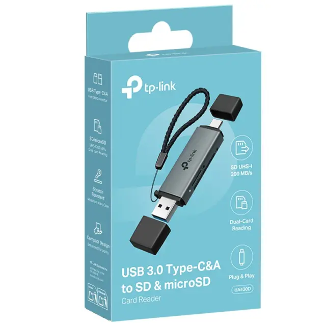 TP-Link UA430D je izjemno priročen USB 3.0 čitalec kartic, zasnovan za uporabnike, ki potrebujejo hitro, zanesljivo in enostavno rešitev za prenos fotografij, videov in drugih datotek. Zaradi dvojnega priključka USB-C in USB-A ga lahko uporabljate praktično na katerikoli napravi - od računalnikov in prenosnikov do tablic in telefonov.