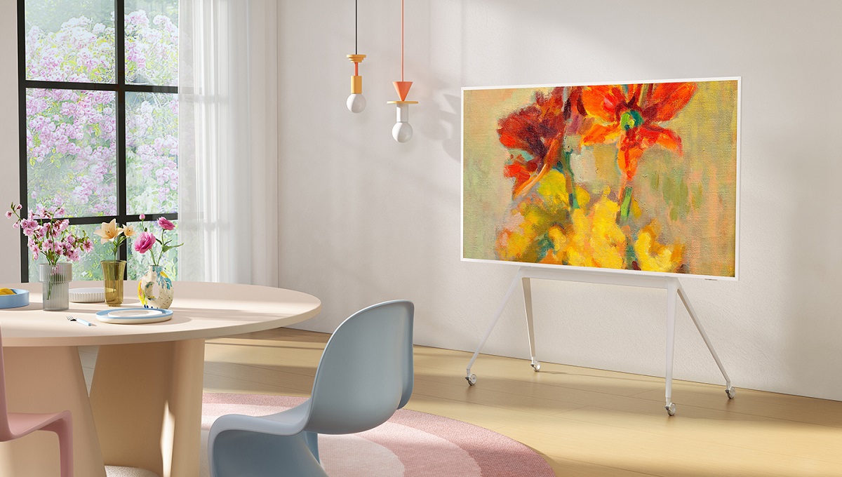 Na voljo oblika v stilu stojala s snemljivimi kolesi, napeljavo kablov, polico za shranjevanje in magnetnim okrasnim pokrovom. Stojalo se prodaja ločeno.