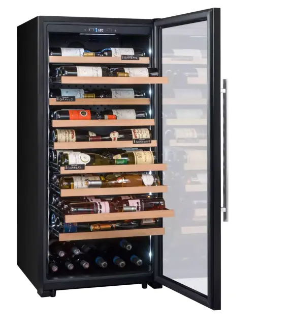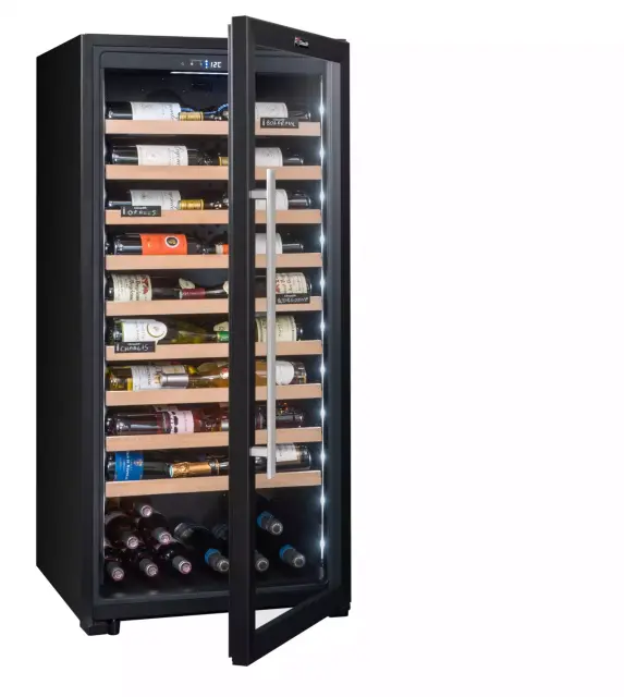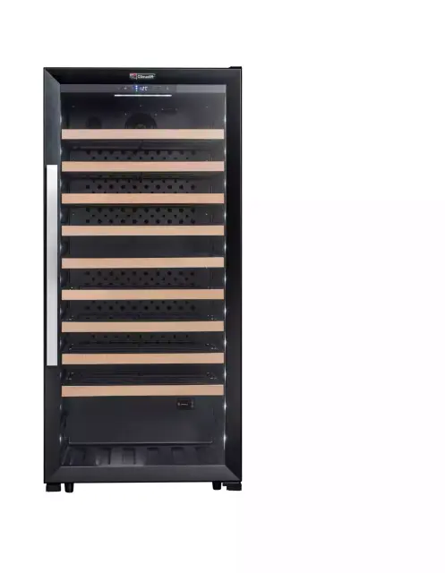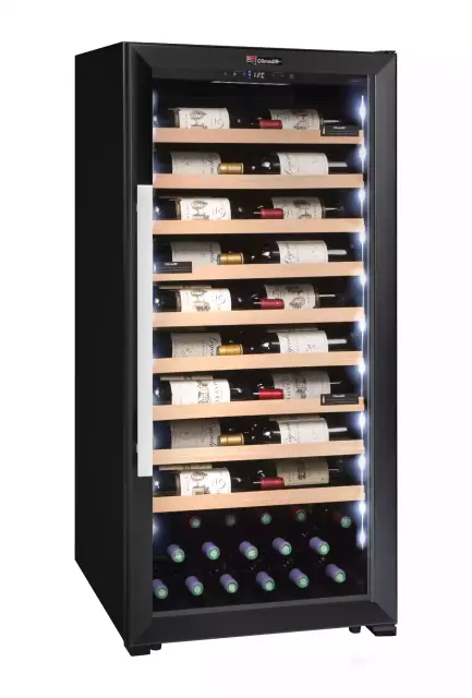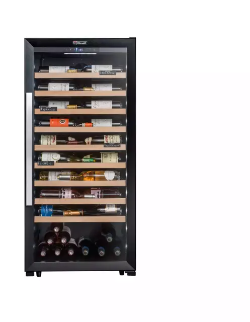Prostostoječa prezentacijska vinska vitrina Climadiff CPF100B1 vam zagotavlja širok temperaturni razpon (5o do 20o C) in kapaciteto hrambe do kar 98 steklenic na 9 mrežnih izvlečnih policah, ki vam omogočajo lažje rokovanje in dostop do vsebine. Hladilni sistem vitrine zagotavlja vodeno, povsem nadzorovano in nastavljivo stabilno temperaturo. Ohladite vaše najljubše steklenice vin v prestižni vitrini, ki z lego steklenic omogoča, da lažje predstavite svojo vinsko karto.
