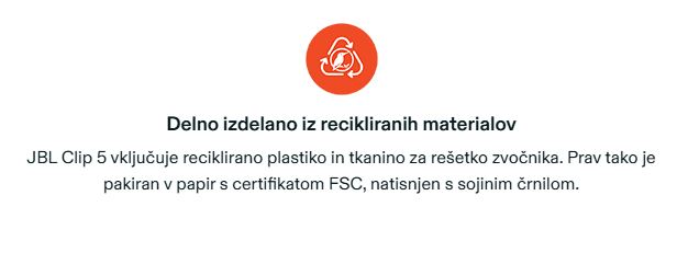 Materiali iz recikliranih virov: Zvočnik vključuje reciklirano plastiko in blago, embalaža pa je izdelana iz papirja s FSC certifikatom in natisnjena s sojinim črnilom.